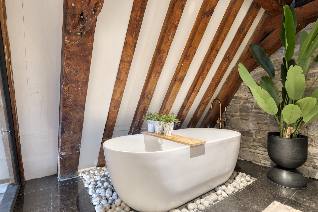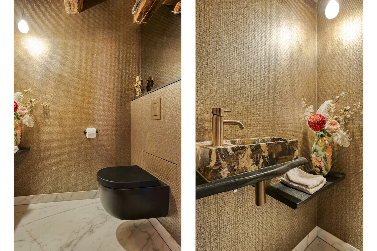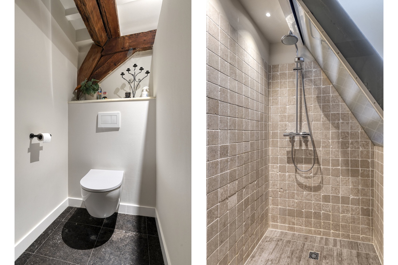 De luxe badkamer is royaal opgezet en beschikt over een inloopdouche, vrijstaand ligbad, dubbele wastafel en een tweede toilet. Vanuit de badkamer is tevens een separate wasruimte toegankelijk.