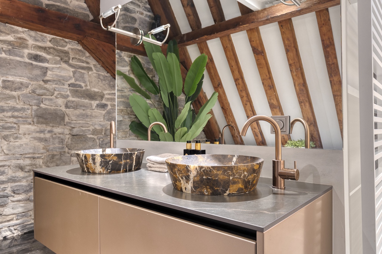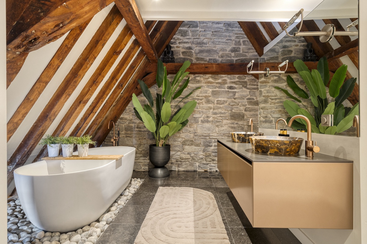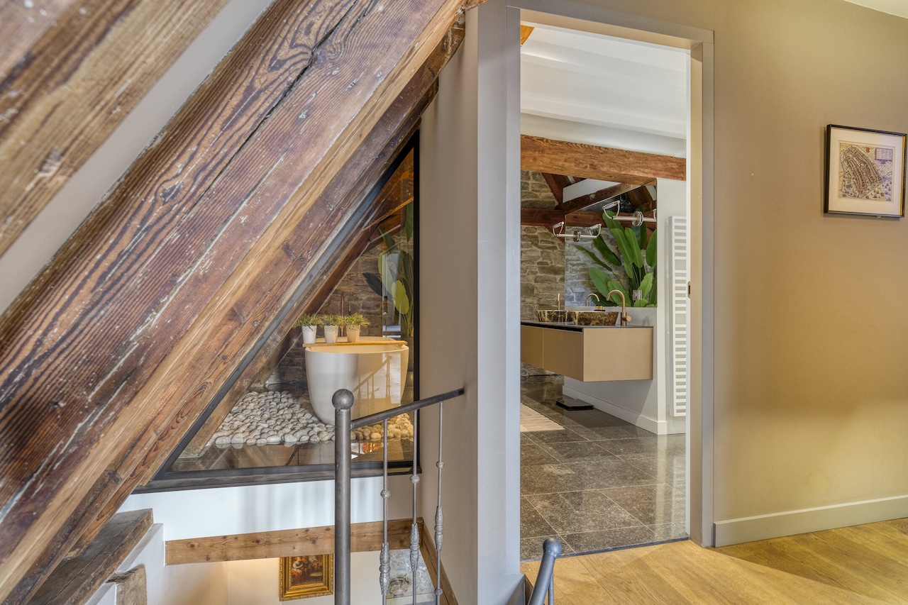 De luxe badkamer is royaal opgezet en beschikt over een inloopdouche, vrijstaand ligbad, dubbele wastafel en een tweede toilet. Vanuit de badkamer is tevens een separate wasruimte toegankelijk.