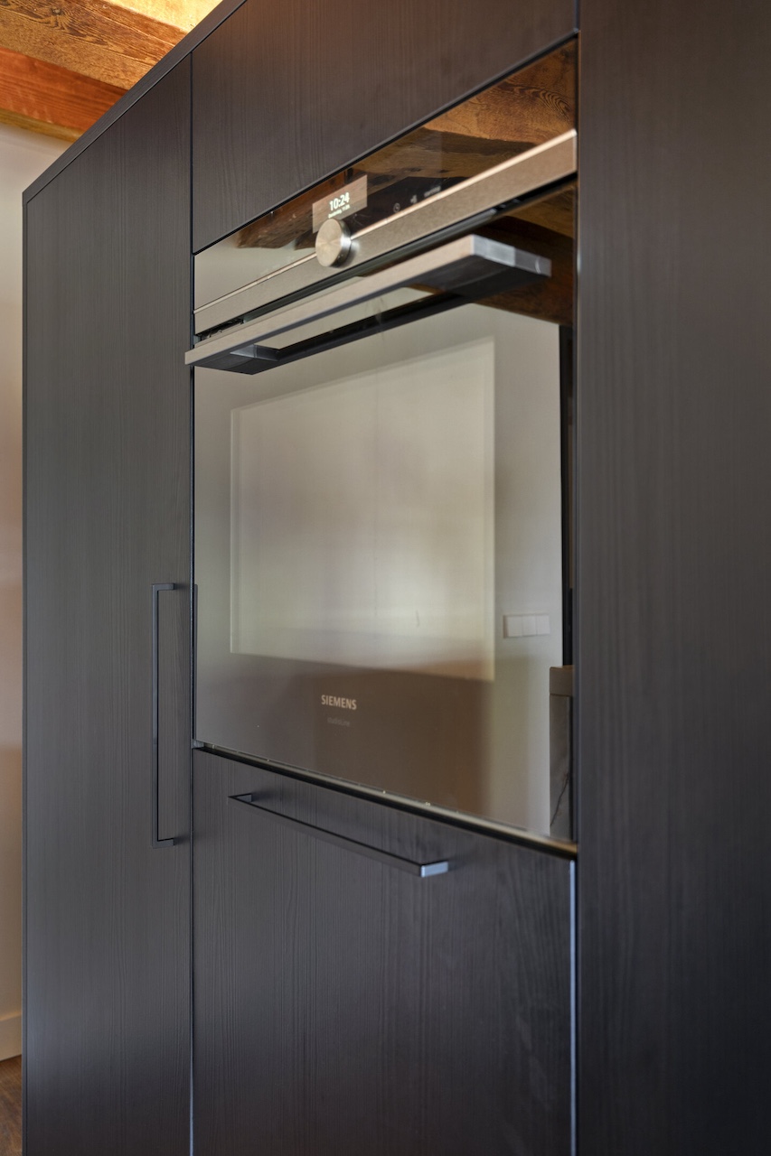 At the rear, the modern open kitchen with cooking island is fully equipped with high-end built-in appliances.