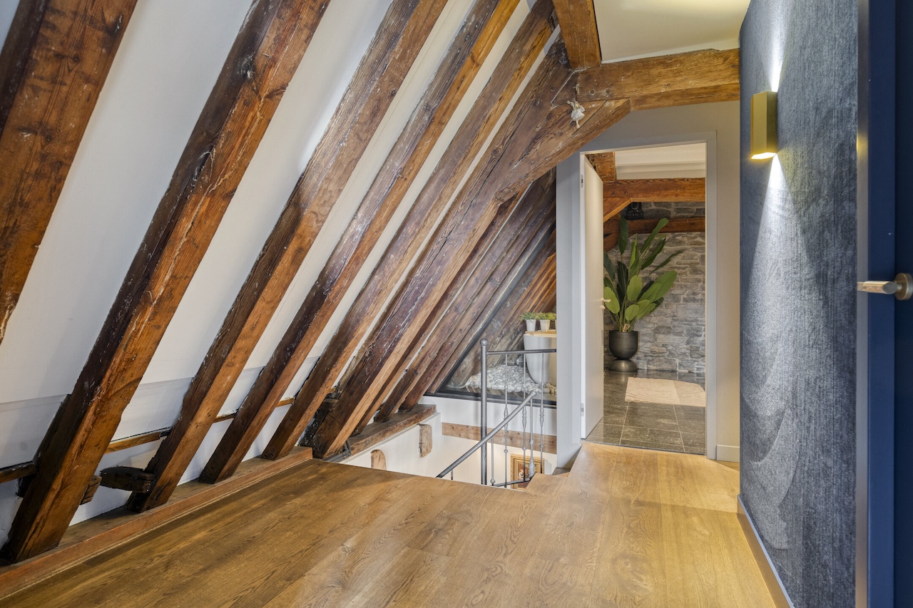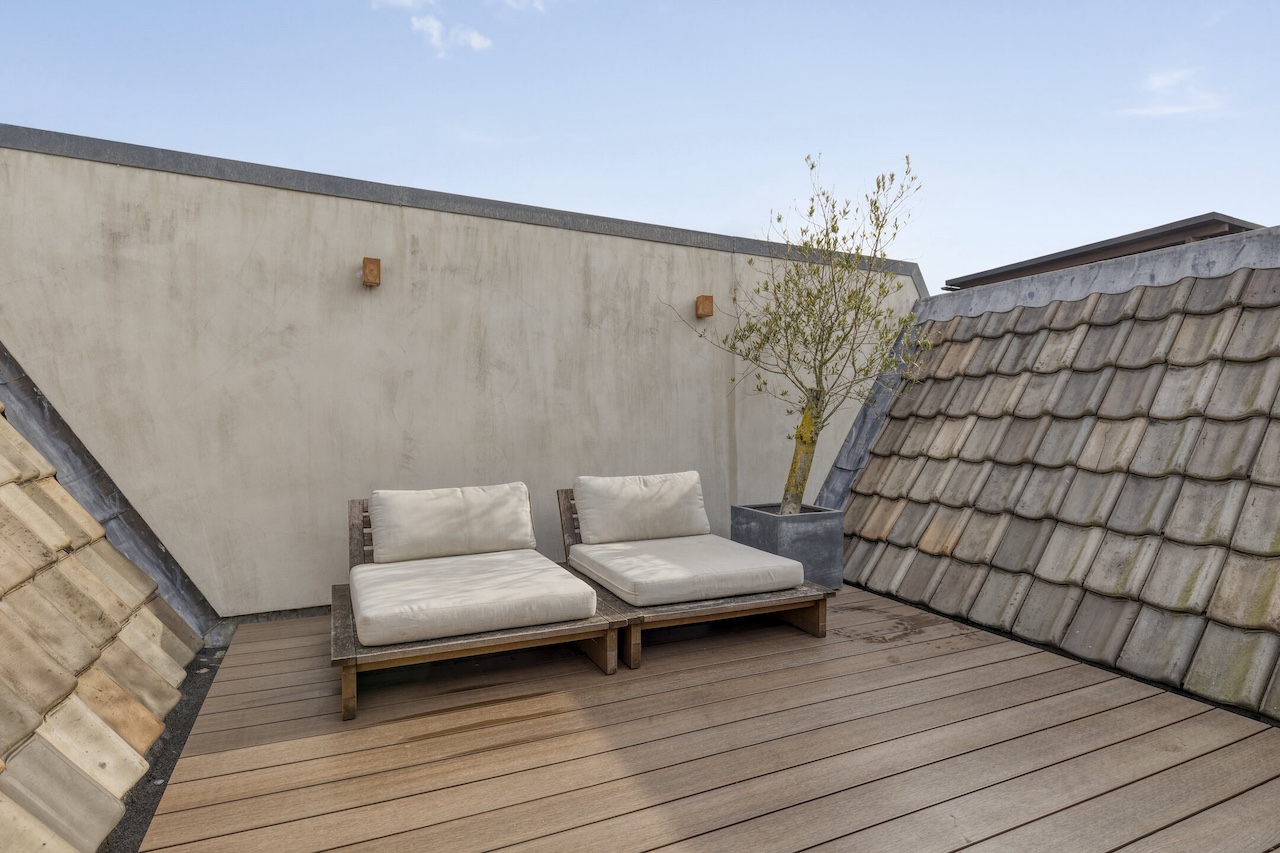 De bovenste verdieping biedt een lichte werk- of leesruimte met toegang tot het zonnige dakterras, waar u in alle rust en privacy kunt genieten van de buitenlucht en het uitzicht over de stad.