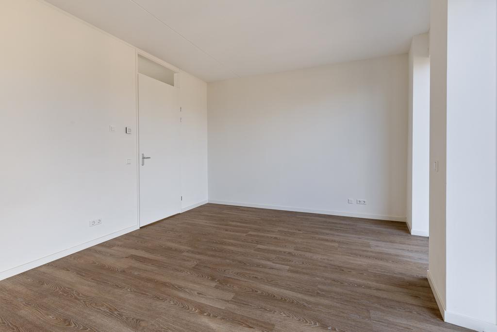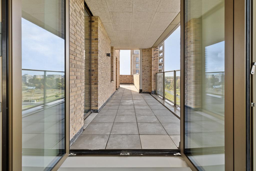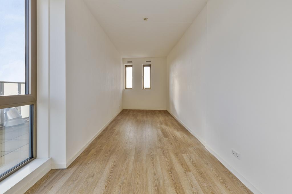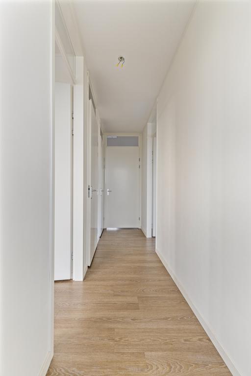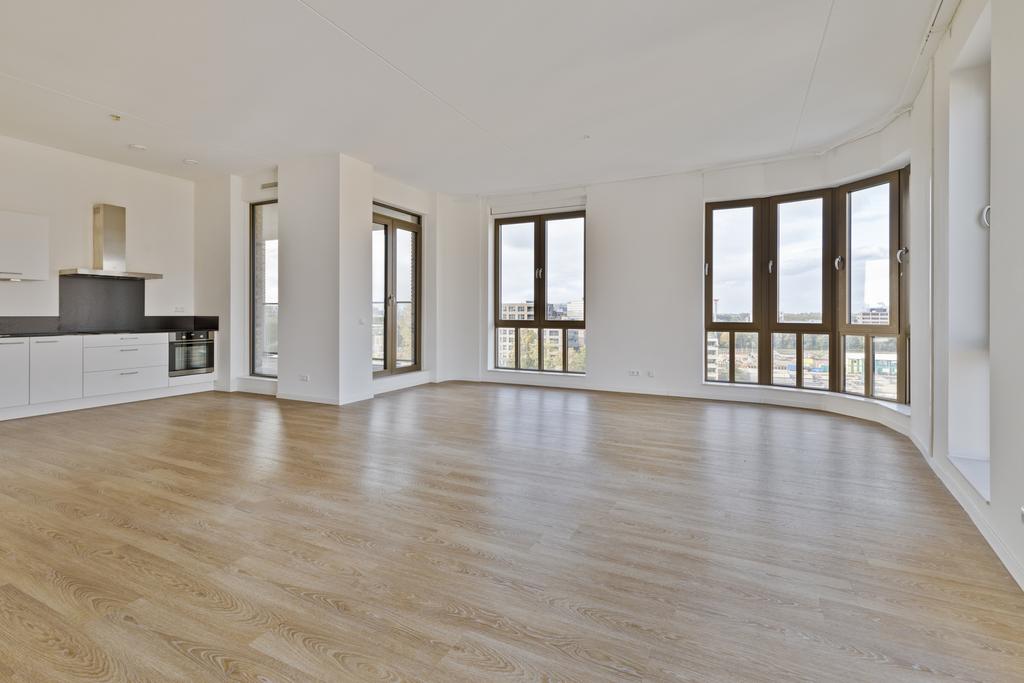 Vanuit de hal is er toegang tot de woon/eetkamer welke zeer praktisch is ingericht waarbij de moderne keuken de woonkamer en het eetgedeelte scheidt. De moderne open keuken, welke is voorzien van alle benodigde inbouwapparatuur, zoals een inductiekookplaat met afzuigkap, koelkast, vriezer, vaatwasser en oven. Vanuit de woonkamer is er toegang tot het balkon met schuifpui. Verder is dit appartement uitgerust met drie slaapkamers, waarbij de kleine slaapkamer bijvoorbeeld als thuiskantoor kan worden ingericht.