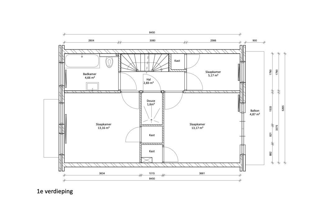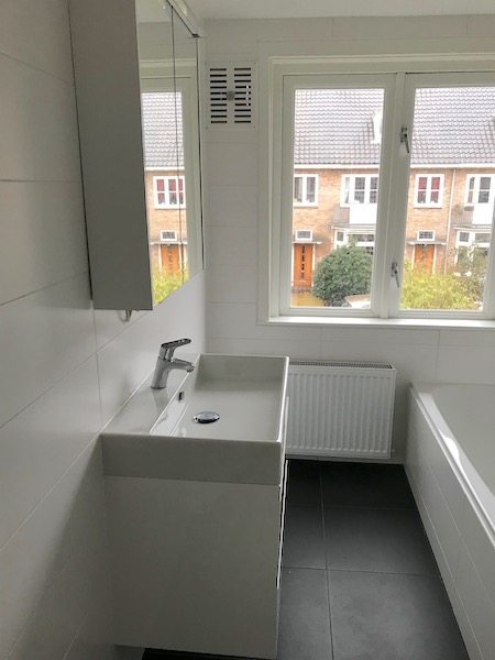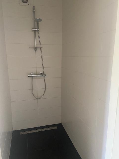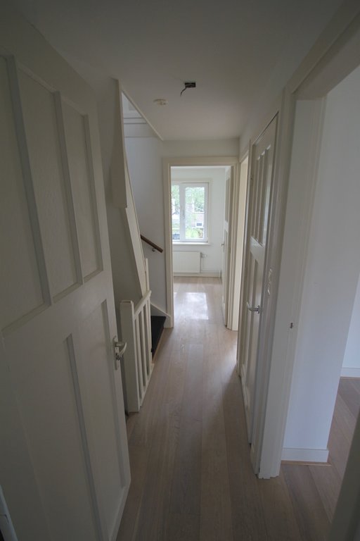 Eerst verdieping: overloop; voorzijde 3 slaapkamers, achterzijde 1 slaapkamer met toegang tot het balkon welke over de volledige breedte van de woning ligt; Voorzijde 2 slaapkamers; badkamer met bad/douche, wastafel en toilet en separate wasmachine/droog kast.
